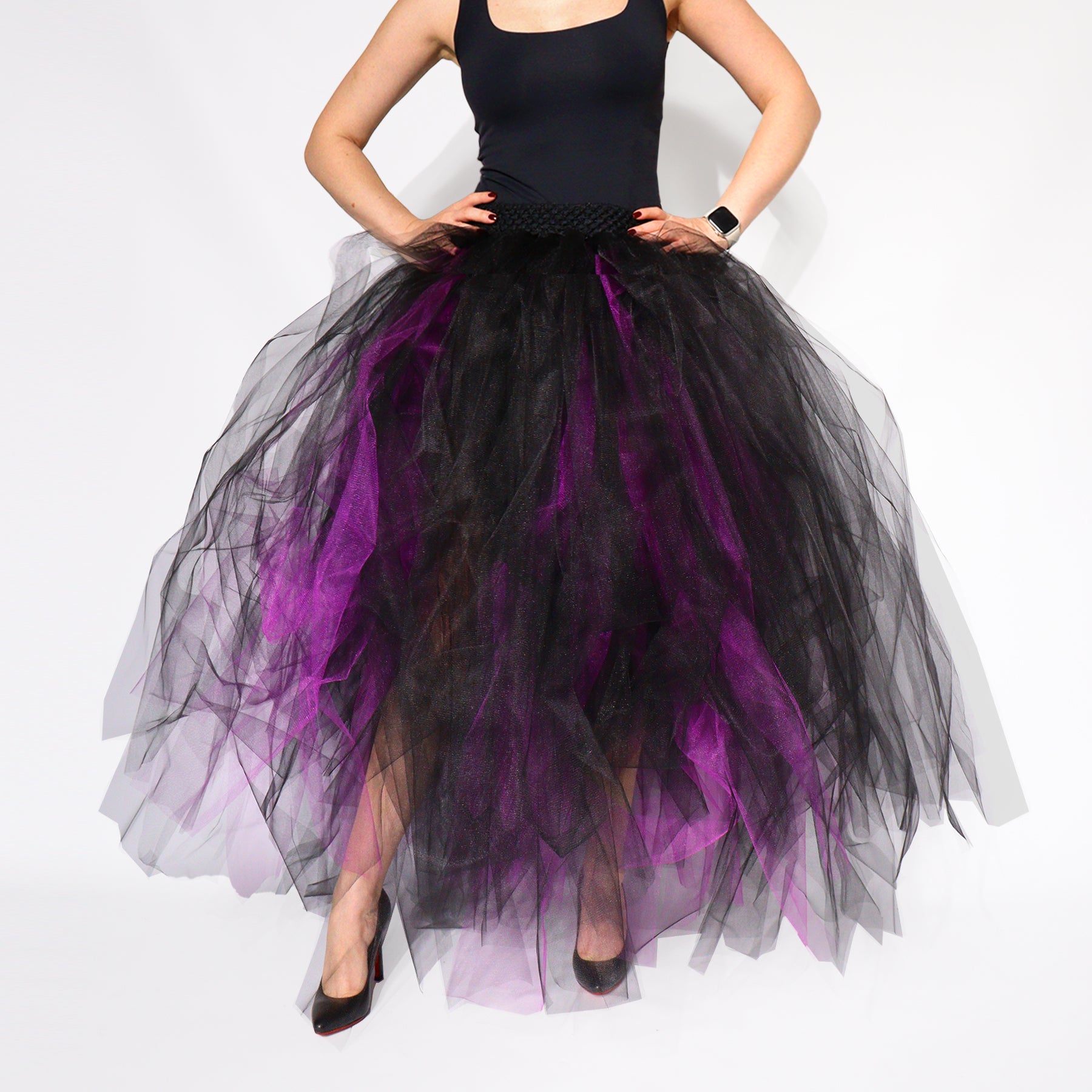 This stunning black and purple tulle skirt is the perfect statement piece for your Halloween look. With its voluminous, layered design and lightweight fabric, it adds magical flair to any outfit — whether you’re dressing as a witch, dark fairy, or gothic queen.