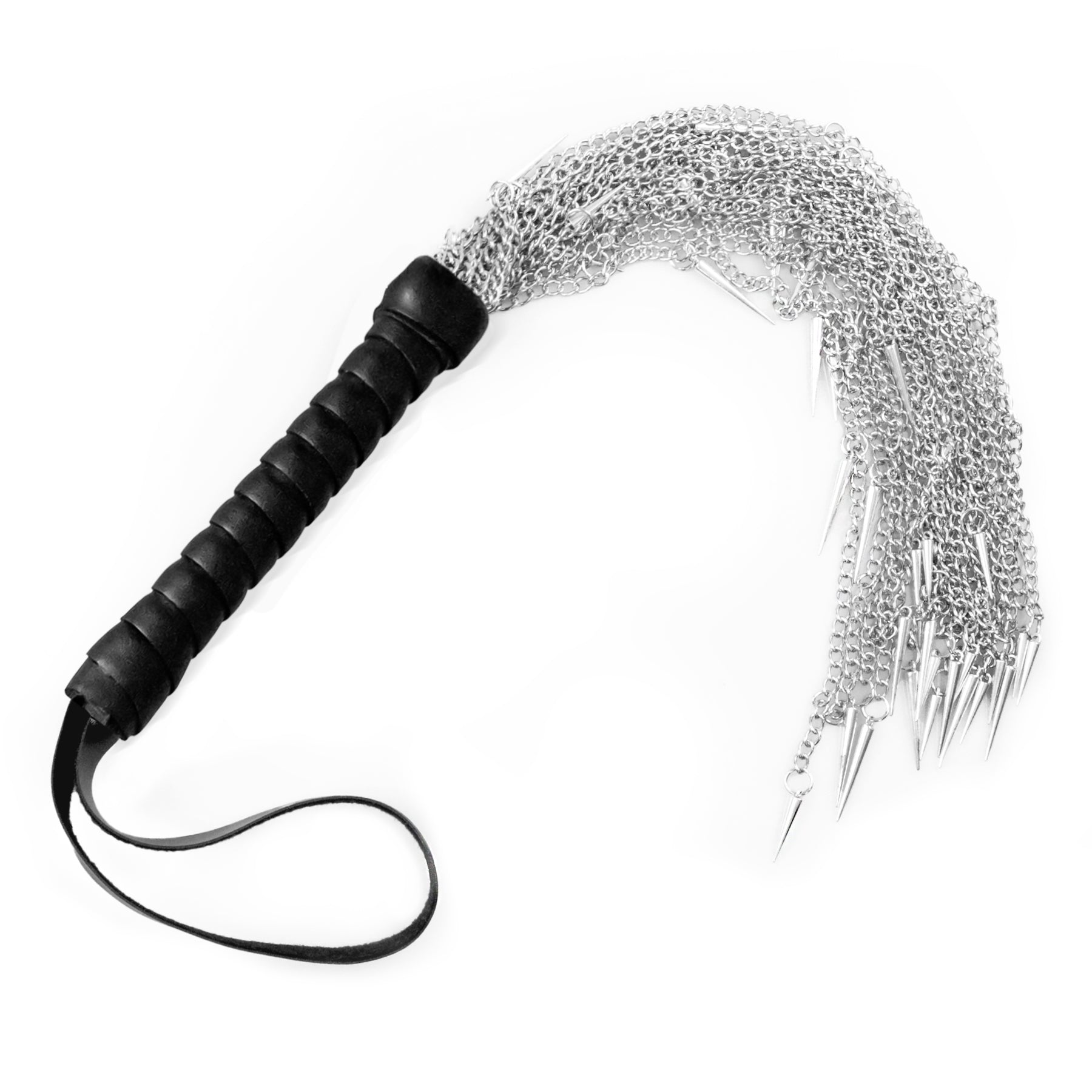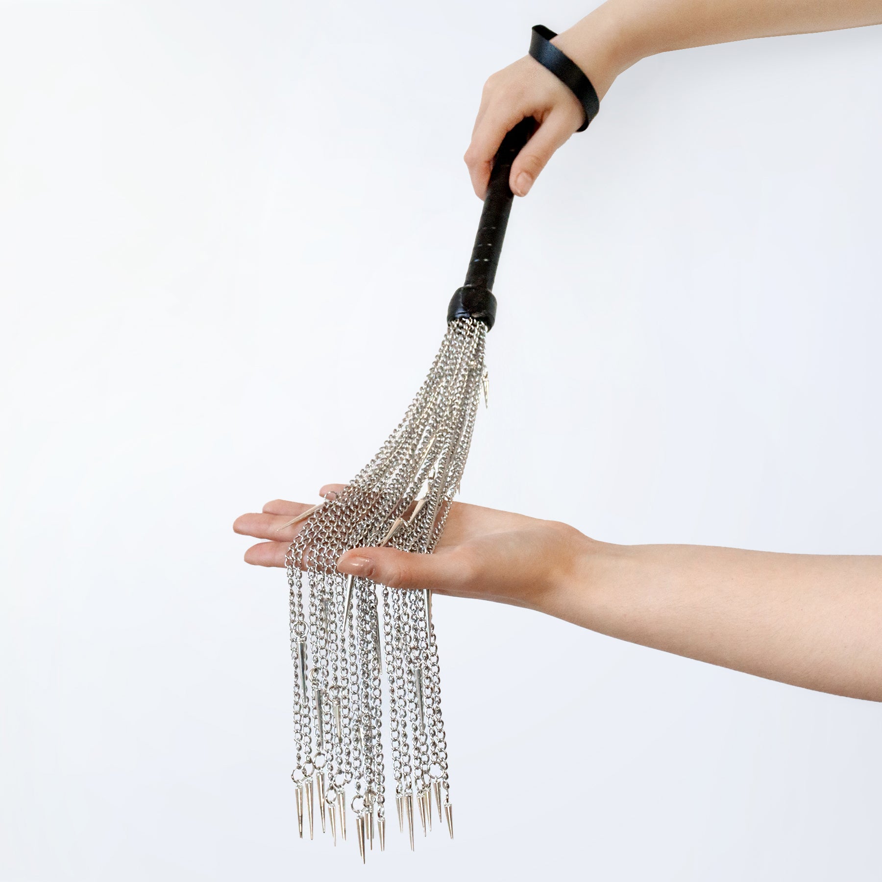 Metal flogger is an unusual and stylish intimate device. This is not just a sex toy, it`s a quality handmade bdsm flogger. This toy is made up of multiple metal chains and has a leather handle, so it`s both a leather flogger and a metal chain flogger.