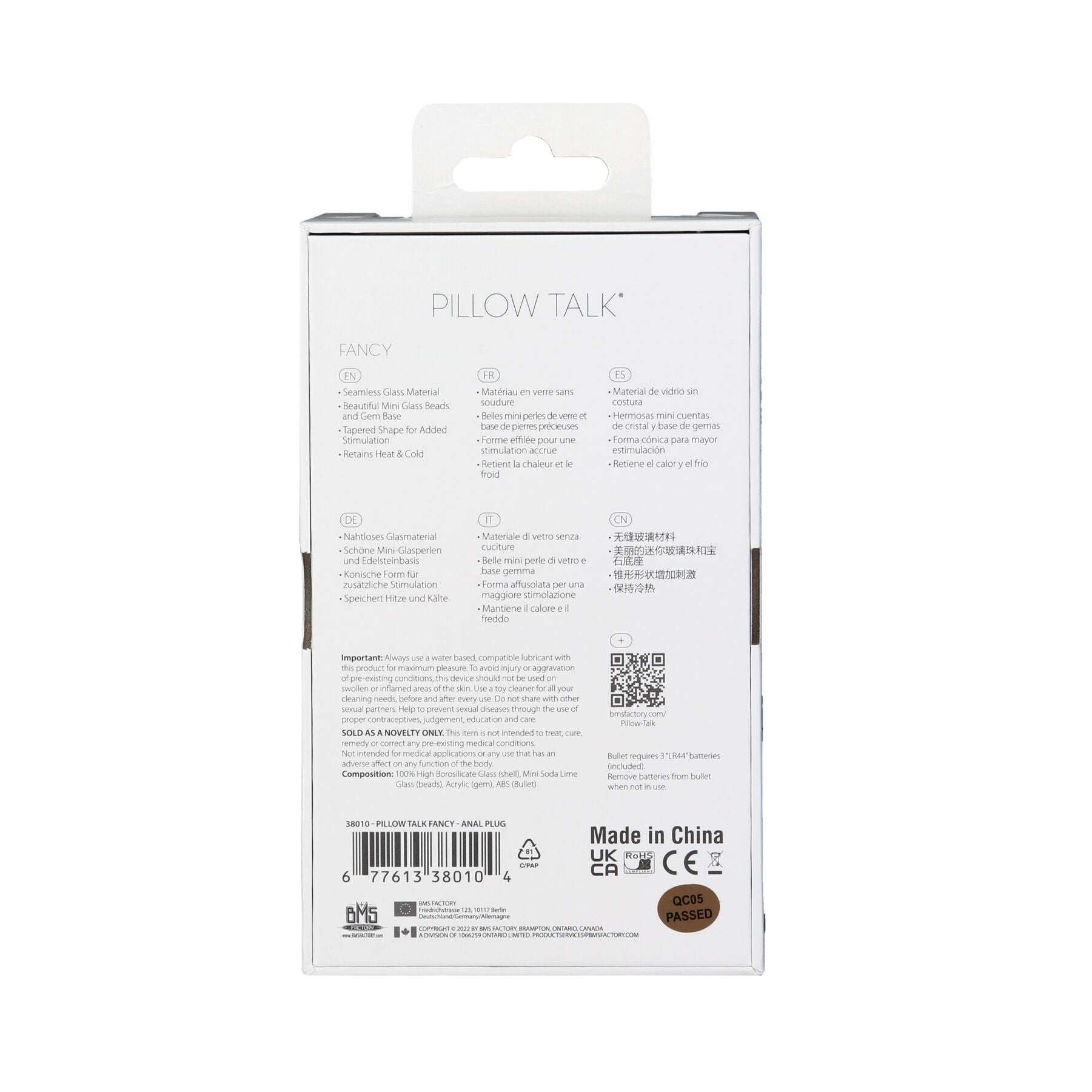 Cleaning is simple — wash it with warm water and mild soap or use a toy cleaner. Inside the package, you’ll also find a PowerBullet® one-speed vibrating bullet (batteries included) for an extra dose of pleasure whenever you want it. The Pillow Talk Fancy Luxurious Glass Anal Plug delivers elegant, refined satisfaction — both visually and physically. Total length: 10.2 cm Insertable length: 8.1 cm Diameter: 3.1 cm Material: Borosilicate glass