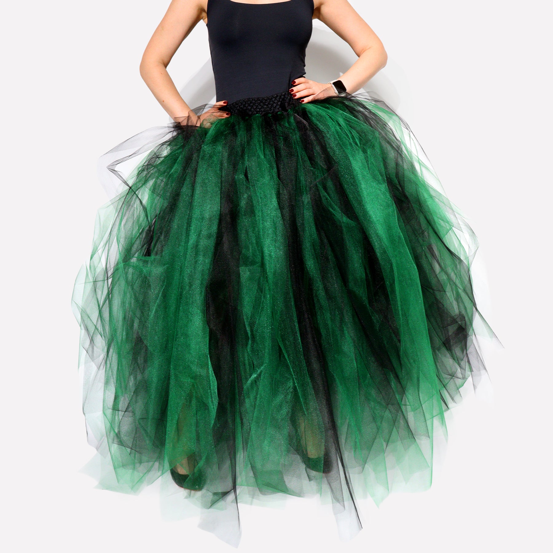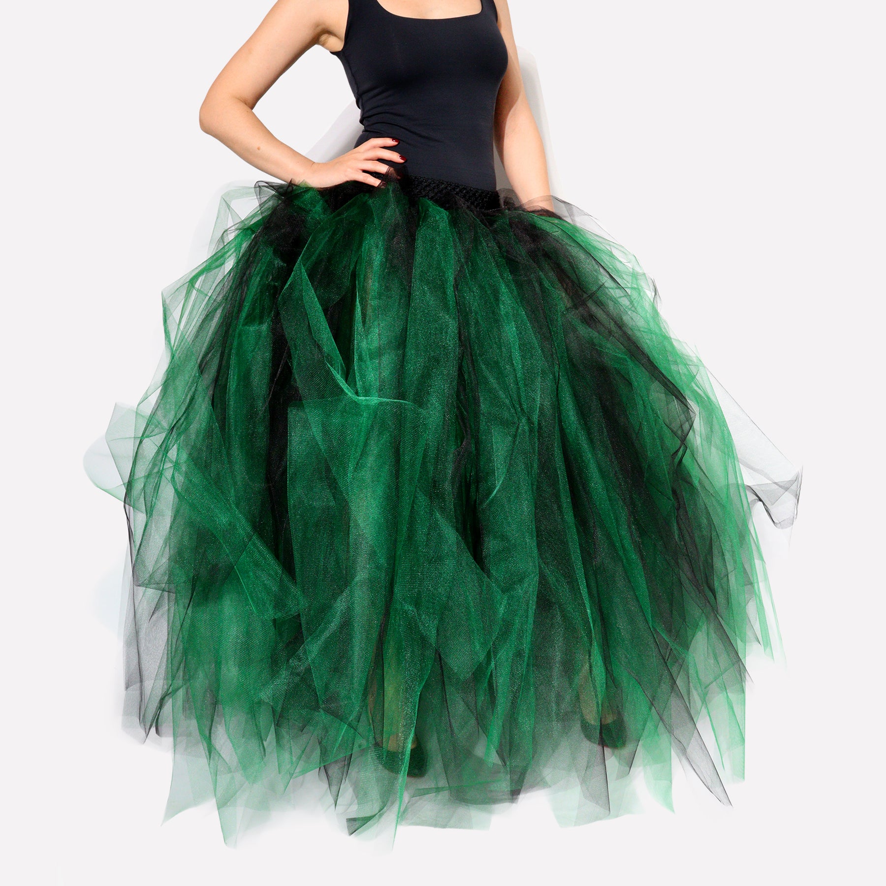 Step into your magic with this green and black tulle skirt, designed to bring drama and elegance to your Halloween or cosplay look. The full, layered silhouette creates stunning volume, while the stretchy waistband ensures comfort and a flexible fit.