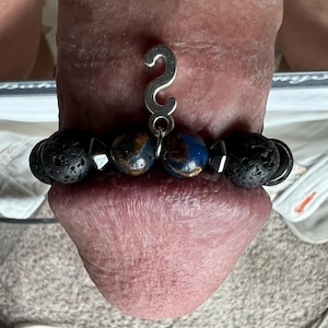 We present you a unique penis jewelry made of natural stones. Handmade penis bracelet consists of three kinds of stones: hematite, lava stone and imperial jasper. Diameter of beads: 8 mm. The cock ring has an elastic band, which makes it stretch well and fits everyone without exception, even owners of an impressive penis size. The stones are smooth and will not cause any discomfort, but only add aesthetics and have a slight stimulating effect during the progressive movements of the pelvis.