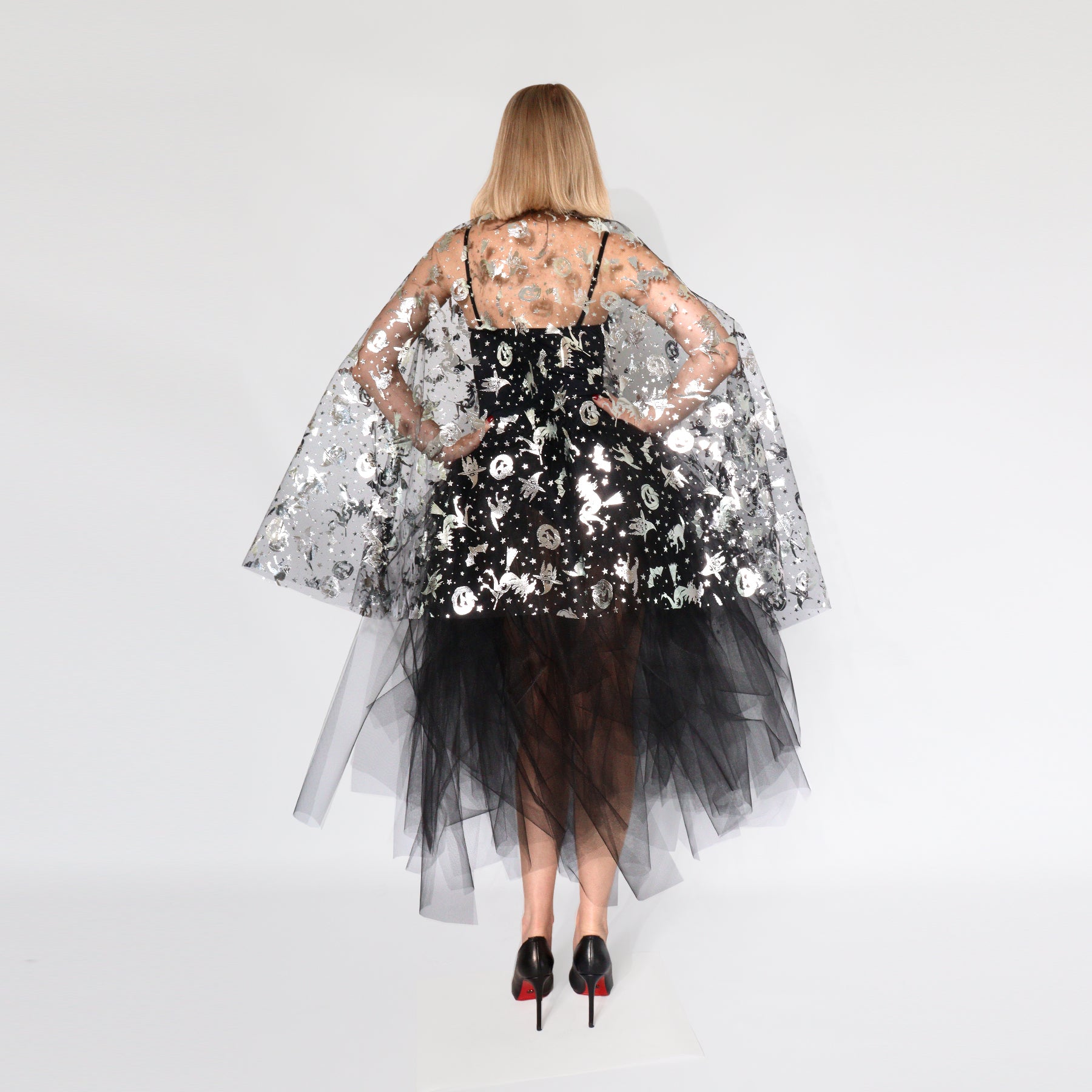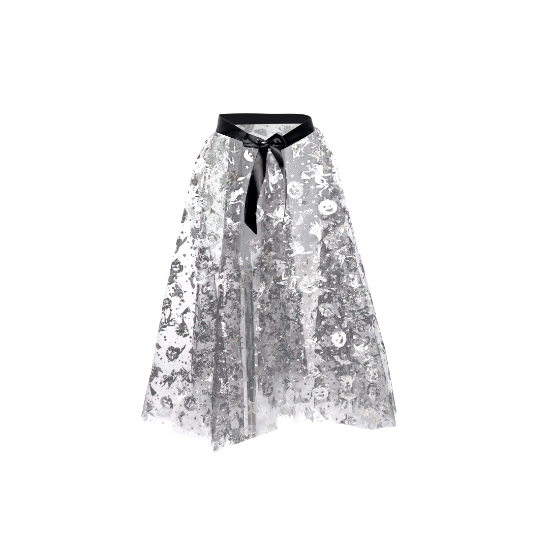This ethereal sheer cape with shimmering silver Halloween print is a magical and versatile piece for your costume. Featuring sparkling pumpkins, moons, stars, ghosts, and bats, it can be worn as a cape, overskirt, or even as a dramatic witch hat accessory. Tied at the neck with a black satin ribbon, it fits both adults and kids.