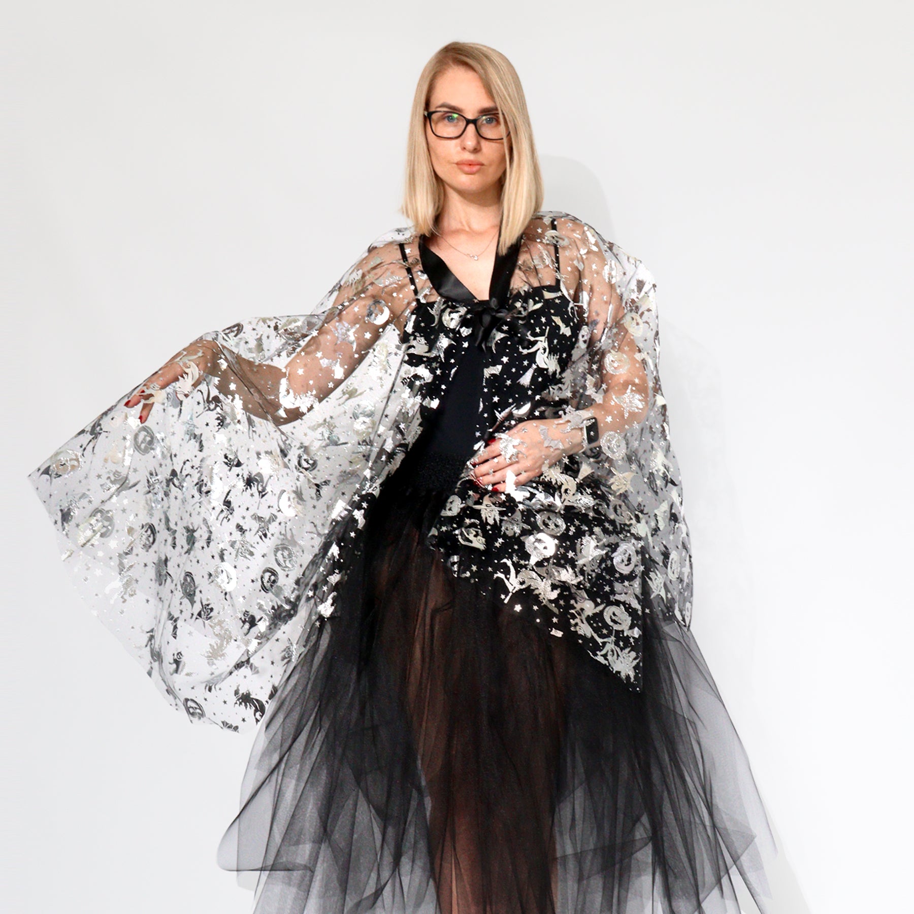 Sheer Cape with Silver Print – Versatile Halloween Cloak, Skirt or Hat Accessory